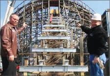 The proprietary track system involves steel tracks and steel cross beams that are fabricated at Rocky Mountain Construction's plant in Hayden and shipped to the theme park, where the company is installing them on the wooden structure, Grubb says. The track system is designed to reduce stress on the wooden structure, allowing more aggressive speeds and turns, he says.