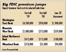 Washington Trust Bank's deposit-insurance costs shot up nearly fivefold to roughly $4.5 million through the first six months of 2009, including a $1.9 million special assessment it incurred June 30, says Jack Heath, president and chief operating officer of the Spokane institution. "It's a really significant cost to banks," Heath says. The bank's deposit-insurance costs were about $950,000 in the first half of 2008but just $321,000 for all of 2007.