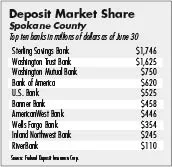 Inland Northwest Bank remained in the ninth spot, despite increasing its market share by nearly half a percentage point, and two-year-old RiverBank leapfrogged over Bank of Fairfield and State Bank Northwest to move into 10th place, with a 1.54 percent market share, up from 1.02 percent a year earlier.