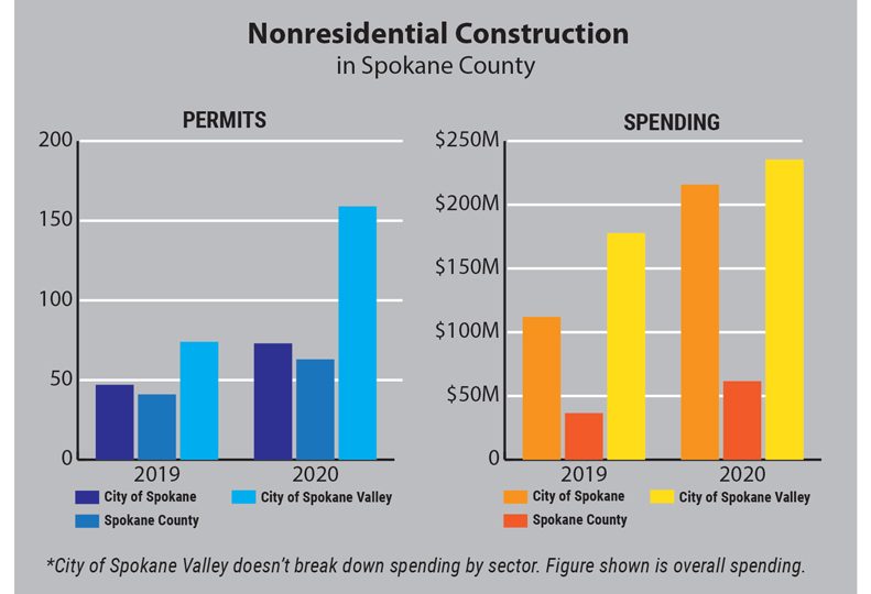 The city of Spokane Valley saw smaller increases, with 159 new commercial permits issued through September, up from 74 during the year-earlier period. Overall spending was up in 2020 to $235.5 million from $177.8 million in 2019.