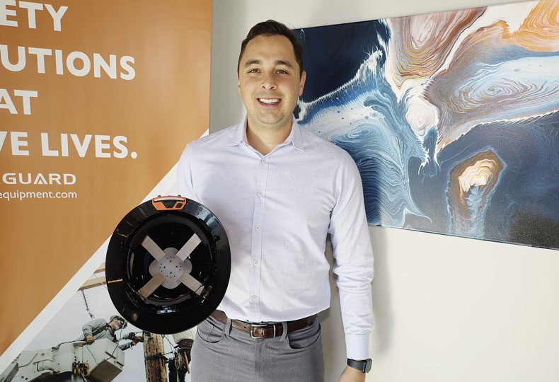 Safeguard Equipment Inc. CEO Tim Ledford holds up a hard hat bearing the clip-on Compass Pro hazard-detection device the company assembles in Post Falls.