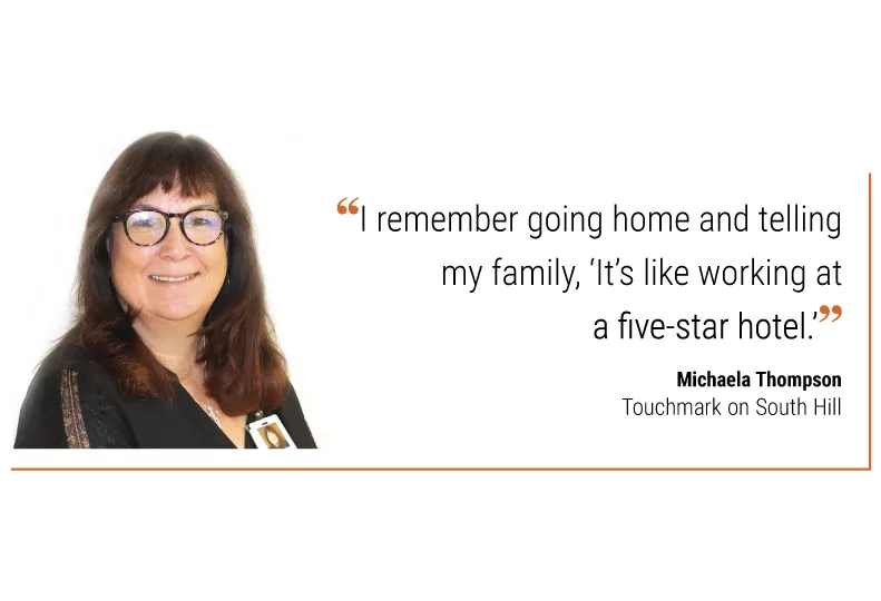 “I remember going home and telling my family, ‘It’s like working at a five-star hotel,’’’ Thompson says of Touchmark. “I was just really impressed with how beautiful the community and campus was. It was a great fit for a mom going back to work.”