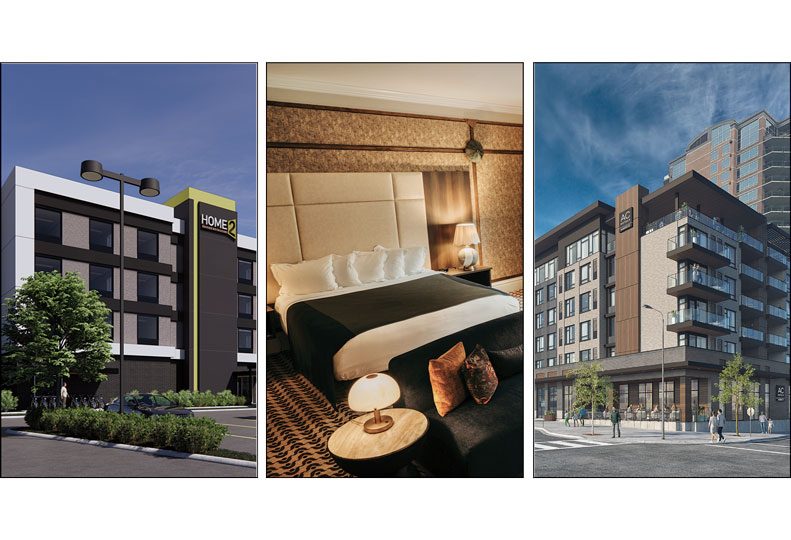 The renderings show, from left to right, the envisioned Home2Suites By Hotel planned in Spokane Valley, the interior design for a guest room at The Louie in downtown Spokane, and the planned Marriott-branded AC Coeur d'Alene, in downtown Coeur d'Alene.