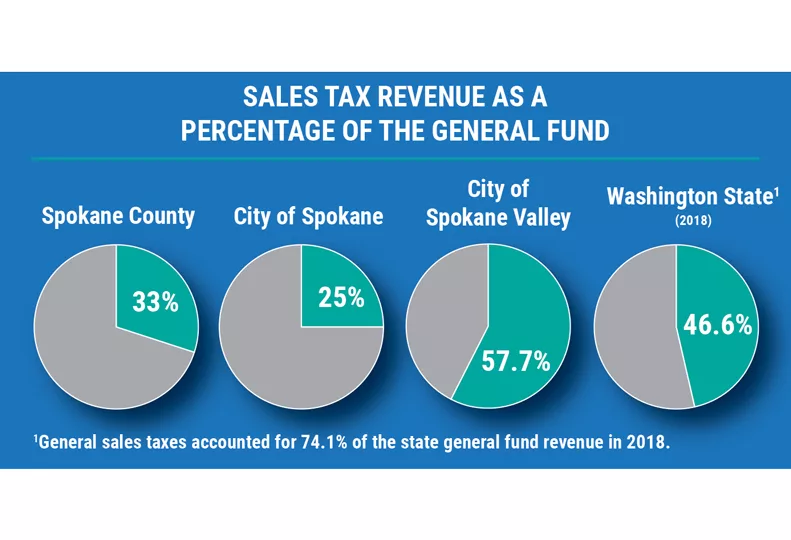 Sales tax revenue accounts for about a third of the total county budget, says Gary Petrovich, Spokane County’s chief budget officer. The total general fund budget for 2020 was just over $211 million, he says, and of that, about $70 million was from sales tax revenue.