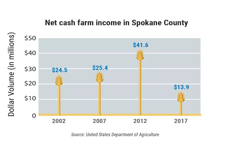 According to the 2017 U.S. Census of Agriculture, which is conducted every five years by the United States Department of Agriculture, net cash farm income in Spokane County dropped by 67% from 2012 to 2017, and the total market value of products sold decreased by 22% during that period.