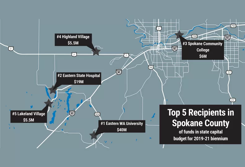In the capital budget, the largest appropriation in Spokane County went to Eastern Washington University, which will receive more than $40 million for renovations to its science building, infrastructure upgrades, and enclosure of a courtyard.