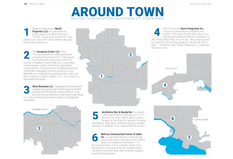 Spokane Valley-based MarEli Properties LLC has purchased an 8,800-square-foot office building at 1720 W. Fourth as an investment. Craig Soehren and Tracy Poff, both of Kiemle Hagood, handled the transaction.