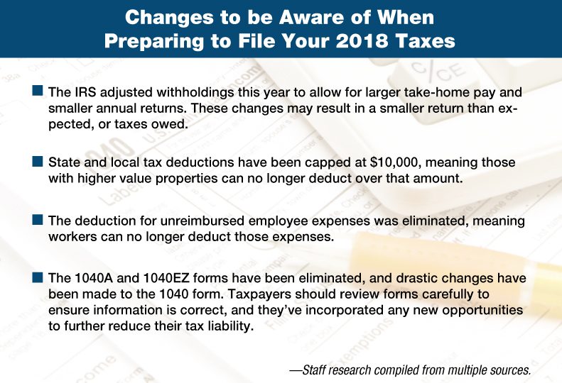 Though withholding changes were a big source of confusion, Sweet says other changes, including those regarding property tax deductions and some job-related employee expenses, have thrown taxpayers for a loop this season.