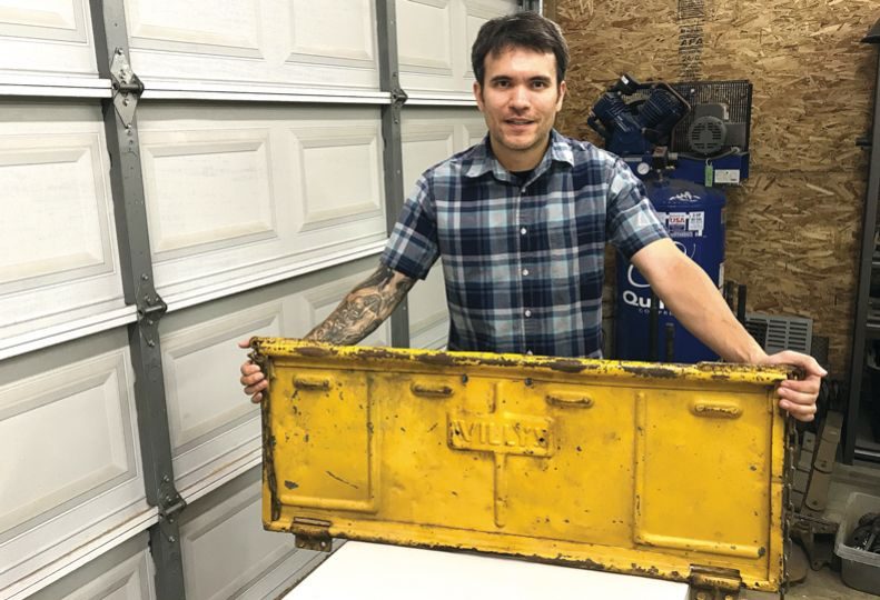 He has a collection of pickup truck tailgates in his shop ready to turn into benches. One, a small yellow Jeep tailgate, he plans to turn into a fold up bench mounted to the wall near his front door.