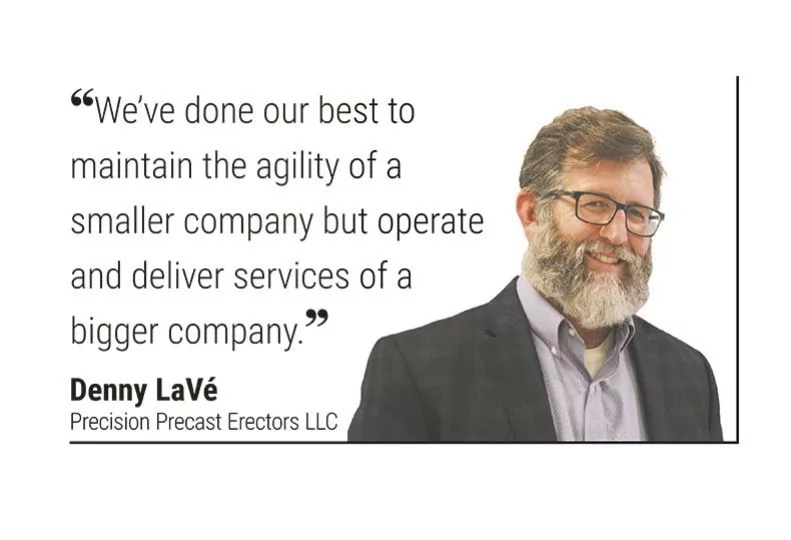 LaVé says Precision Precast has grown to earn about 80% repeat business with about 90% of revenue from precast installation work.