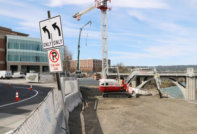 The possibility of closing off Spokane Falls Boulevard would create a scenario that exists there during current construction of the CSO tank, with westbound traffic on the street merging with motorists departing from the River Park Square parking garage and having to turn onto Lincoln Street.