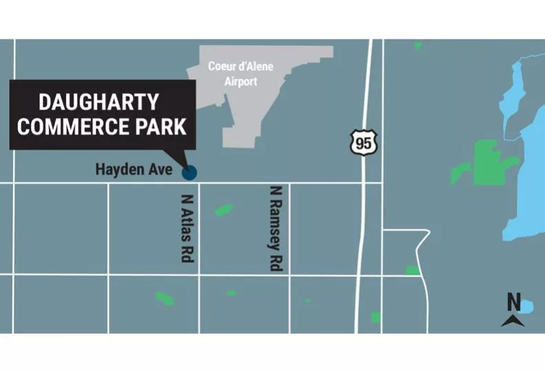 Daugharty, who is also an attorney and owner of Daugharty Law Group, in Coeur d’Alene, says the commerce park will be located on a 14-acre portion of 50 acres of land the development company owns at the northwest corner of Hayden Avenue and Atlas Road, about a mile southwest of the Coeur d’Alene Airport.