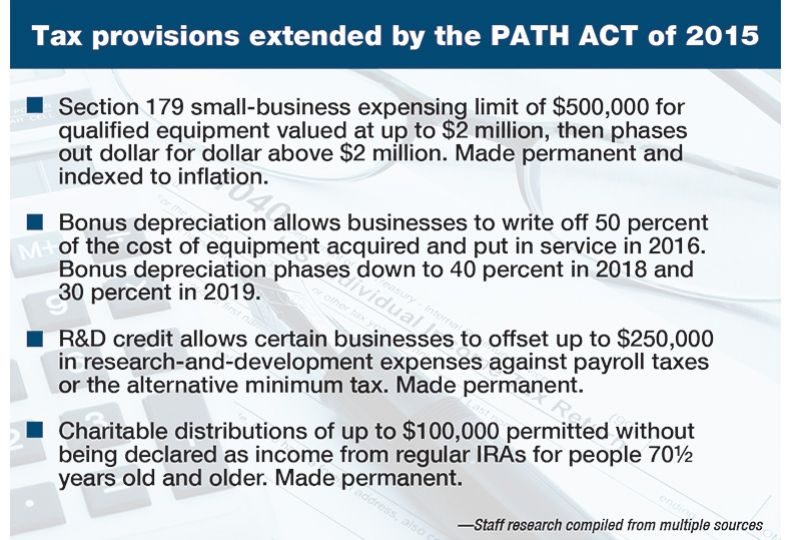 Late last year, though, Congress passed the Protecting Americans from Tax Hikes Act, which extends some provisions and makes some of them permanent, including expense allowances for certain business equipment, research-and-development credits, and allowances for certain charitable distributions.
