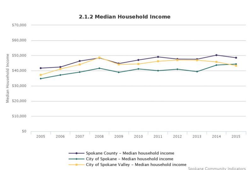 Comparatively, median household income in the city of Spokane Valley fell in 2015 for the third straight year, although it had been consistently higher than in the city of Spokane over the past decade.