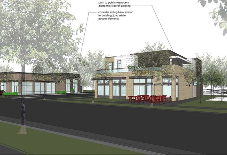 The single-story building will be adjacent to the Centennial Trail, which is south of Ohio. The two-story building will be on the north side of Ohio, south of and parallel to Summit Parkway.