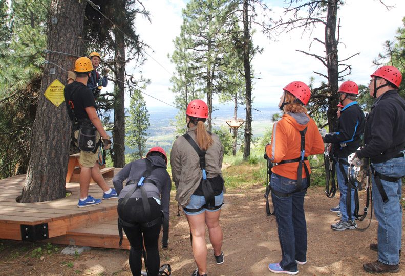 The tour goes like this: Zip liners start out in Mica Moon’s Liberty Lake office. During the office visit, guests are weighed, sign a photo release and liability waiver form, and are briefed on certain safety aspects of the tour. Guests load into a van with the Mica Moon logo emblazoned on the side and caravan up to Mica Peak, while one of the two tour guides provides some history of the area.