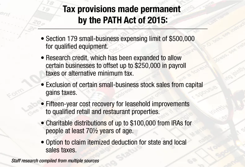 Provisions made permanent in the Protecting Americans from Tax Hikes Act of 2015 include Section 179 expensing, the research-and-development credit, an allowance for qualified charitable distributions, and the option to deduct state and local sales taxes.