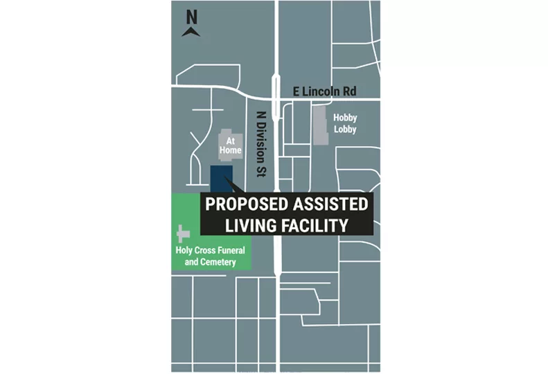 A pre-development conference application shows the project includes a five-story, 25,000-square-foot building with up to 110 assisted-living units and up to 28 memory care beds.