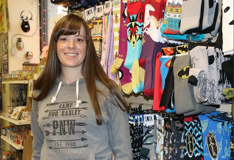 Menzer says one of the key strategies at Boo Radley’s is to try to identify the trendy items that year, and stock up on them. This year, Menzer says, the hot gift item is socks.