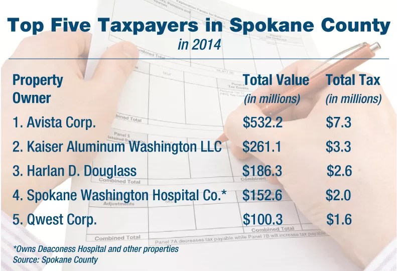Spokane-based Inland Empire Paper Co. and Qwest Corp., a Denver-based real estate holding company for the communications company CenturyLink Inc., are ranked fifth and sixth, each with tax bills of $1.6 million, although Qwest’s 2014 tax bill is 12.4 percent lower than its 2013 bill.