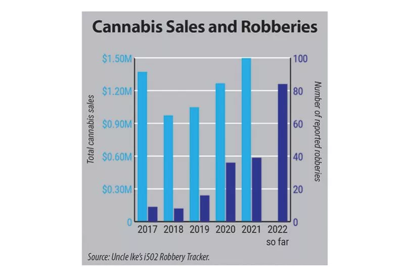 As of May 3, 84 armed robberies had been reported at Washington cannabis stores so far this year, according to Uncle Ike’s i502 Robbery Tracker, an online database provided by Seattle-based cannabis retail chain Uncle Ike’s. That’s more than double the armed robberies targeting cannabis stores in the state in 2021.
