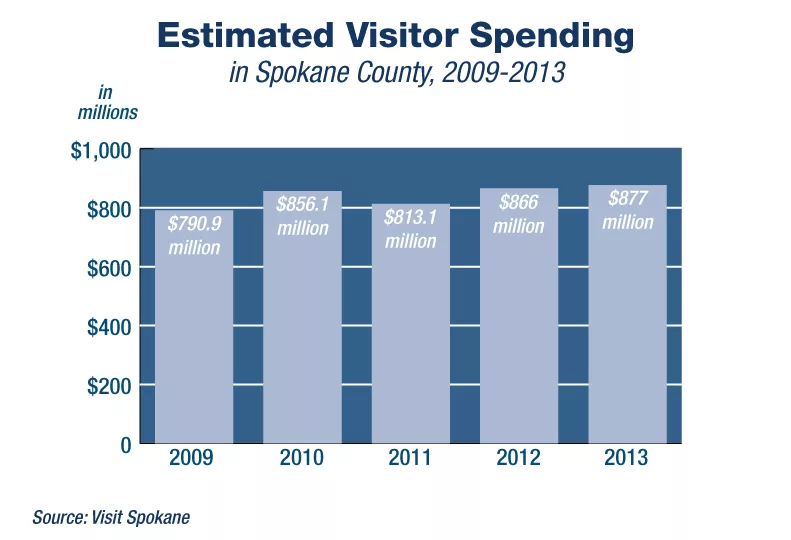 Preliminary numbers from a report provided by Dean Runyan Associates, a Portland, Ore.-based travel research group, indicate that visitors spent $877 million in Spokane County, up slightly from $866 million in 2012, says Cheryl Kilday, president and CEO of Visit Spokane. The Runyan Report was presented to Kilday’s office late last month.