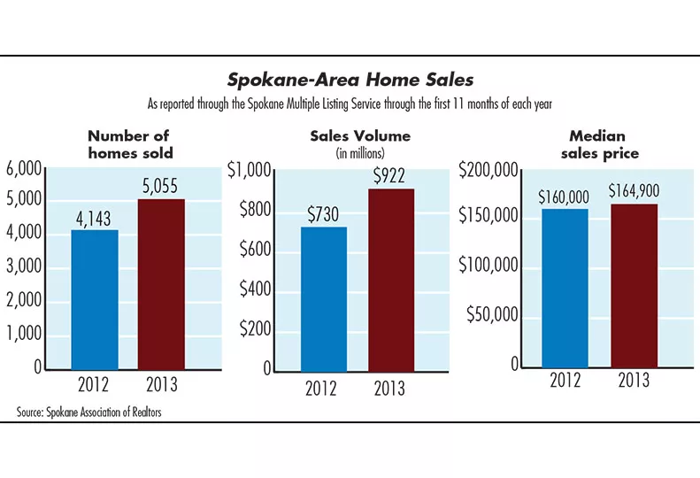 In the first 11 months of 2013, 5,055 homes were sold through the Spokane Association of Realtors’ Multiple Listing Service, an increase of 22 percent compared with the year-earlier period, says Rob Higgins, the association’s executive vice president.