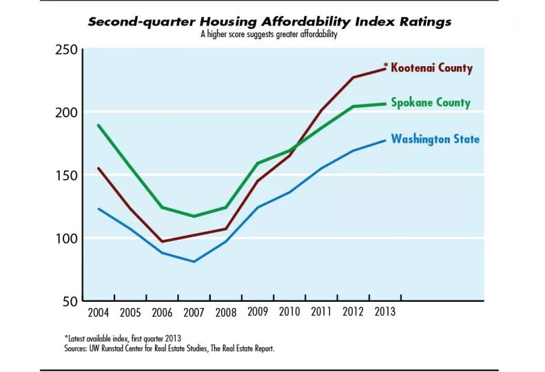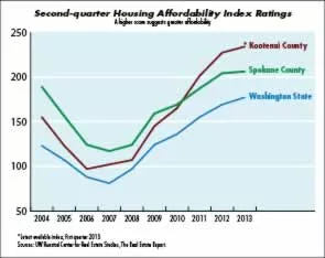 In results Crellin recently compiled for the second quarter of 2013, Spokane County scored an affordability index rating of 206, the Spokane market's highest second-quarter rating since 2003, when the county scored 208 in the index before the last boom-and-bust housing cycle.