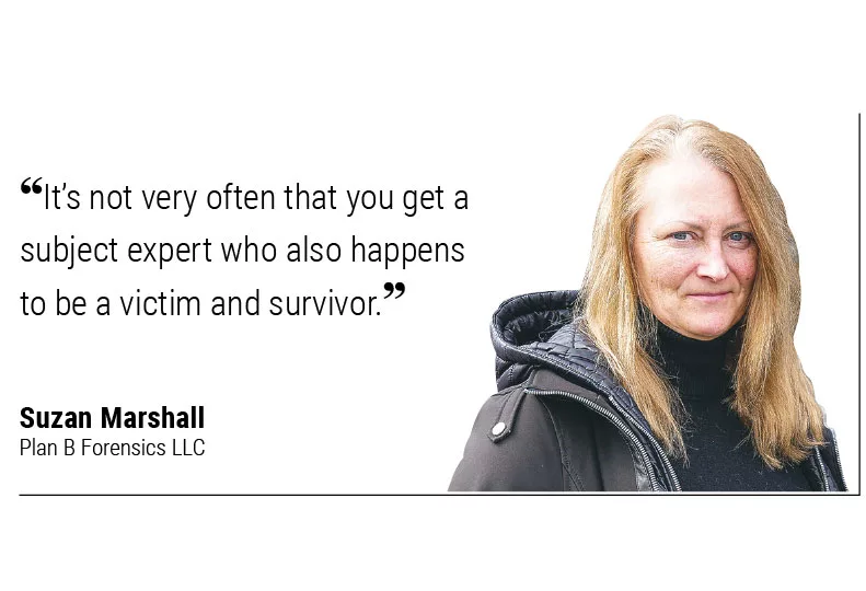 Marshall began working as an advocate for victims of violent crimes, then enrolled in and passed a medicolegal death investigator course and exam, as well as the certification exam. In April 2019, she co-founded Plan B Forensics with Heather Ostby, who has a health care administration background and is working toward a death investigation certification. Plan B is entirely cloud-based, so Marshall says she and Ostby typically work from home.