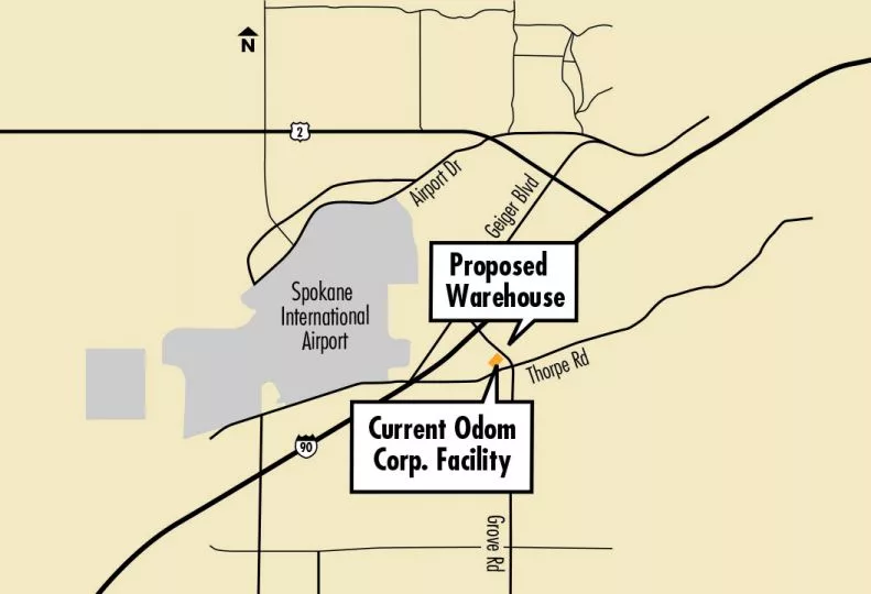 Jerry Dexter, Spokane-based senior vice president for supply-chain management at Odom, says the company plans to break ground in early September on the new facility, which is planned for 43 acres of land across from its current warehouse, at 4122 S. Grove. The company hopes to complete and move into the new facility in April 2014, he says.