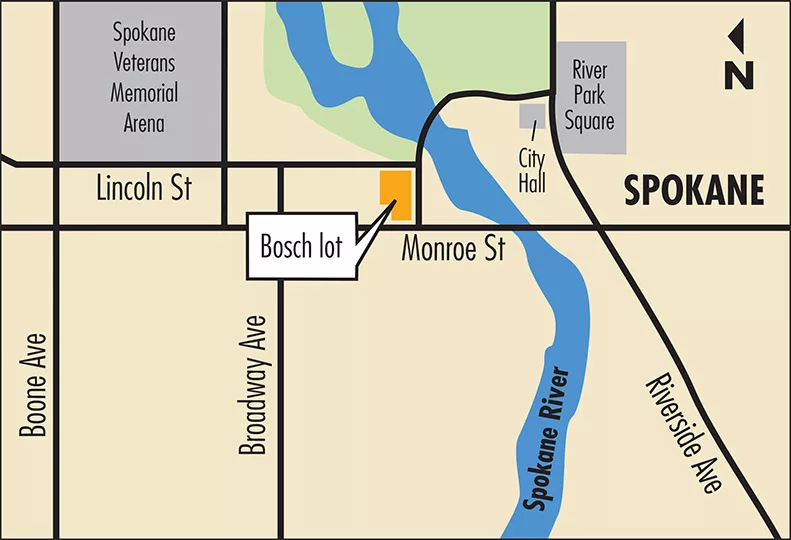 Known as the Bosch lot, the parcel is located on the north side of Bridge Avenue and northeast of the Monroe Street Bridge, essentially across the river gorge from Spokane City Hall. Currently, the city operates a 132-stall parking lot on the land.