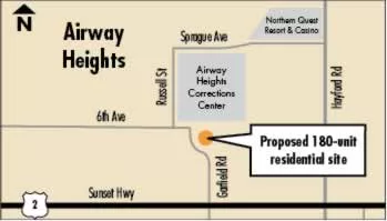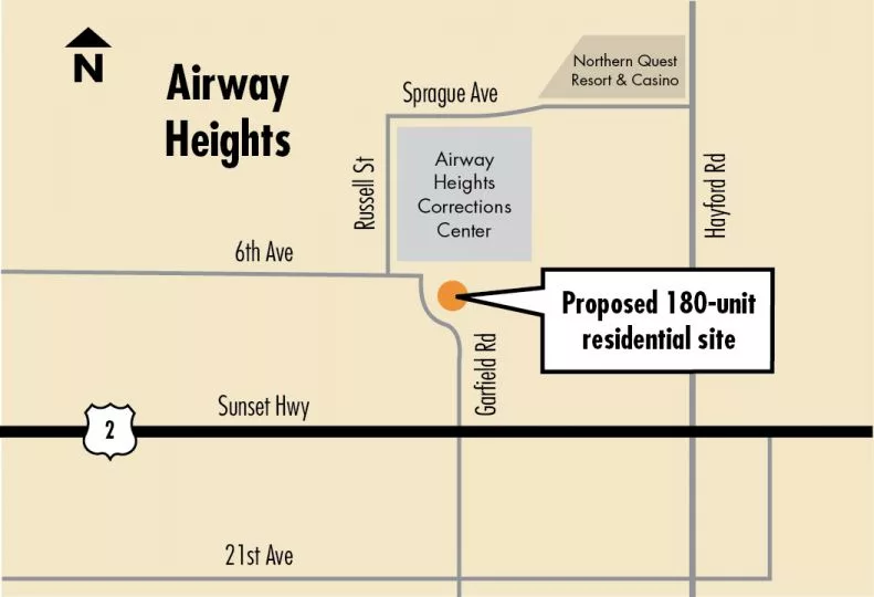 The organization will collaborate with Habitat for Humanity-Spokane and Spokane-based Community Frameworks to build 180 units of multifamily, single-family, and factory-built homes on vacant property near 6th Street and Garfield Road, just south of the Airway Heights Corrections Center and near the Northern Quest Resort Hotel, says Tobby Hatley, spokesman for the nonprofit.