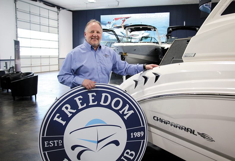 During the boating season, Freedom Boat Club will have five new boats moored at River’s Edge Marina, including three 22-foot Bennington pontoons, one 23-foot Chaparral runabout with an open bow, and one Robalo center-console fishing boat.