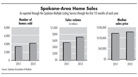 In the first 11 months of 2012, a total of 4,131 homes were sold through the Spokane Association of Realtors' Multiple Listing Service, a 12.6 percent increase over the same period in 2011. The median home sales price for the first 11 months of 2012 was $160,000, a 3.2 percent increase compared with the year-earlier period.