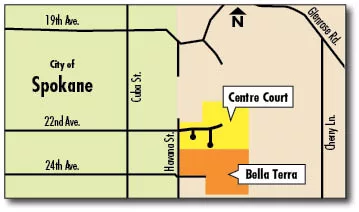 The land west of Havana Street is within the city of Spokane and is developed for single-family residential use. Centre Court, a 53-lot residential subdivision currently under development, is just north of the Bella Terra parcels, and the 19-lot Pine Cliff plat is near the southwest corner of Bella Terra.