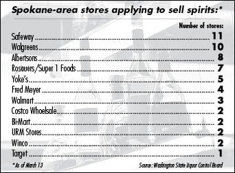 Spokane area-based retailers that have applied to the Liquor Control Board to sell liquor at multiple locations include Rosauers Supermarkets Inc., URM Stores Inc., and Yoke's Foods Inc.