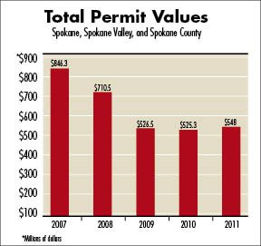 In the city of Spokane, though, the total value of permits fell to $236.8 million in 2011, down from $252 million the previous year.