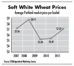 Soft white wheat prices averaged about $6 a bushel last month for exports out of Portland, Ore., the U.S. Department of Agriculture reports, down from about $6.30 a bushel for the same month in 2010.