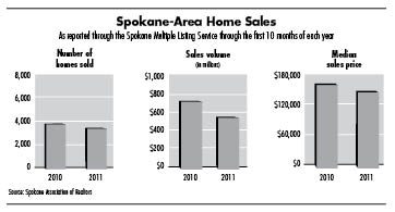 For the first 10 months of this year, the median sales price for homes sold through the association's Multiple Listing Service was $155,000, down from $165,000 for the same period last year. About 3,300 homes were sold in Spokane County through the Spokane MLS in the latest 10-month period, down from about 3,600 homes in the year-earlier period.