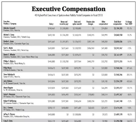 Contributing heavily to the overall jump in executive pay was large increases in compensation for the top brass at Itron Inc., the Liberty Lake-based maker of automated meter-reading technology. The company's CEO Malcolm Unsworth tops this year's list, and the other four named executive officers appear in the top 10, with total compensation increases ranging from 95.1 percent to 438.6 percent. In contrast, only three of the company's five top executives were in the top 40 last year.