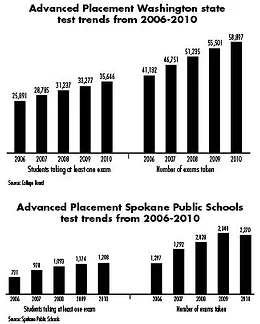 In the Spokane area's largest school district, Spokane Public Schools, the number of students taking an AP exam has increased by 65 percent in the last five years, to just over 1,200 high school students in 2010 from 730 in 2006, district data show.