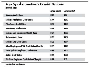 On Sept. 30, 2010, the most recent date for which marketwide data is available, all 20 of the credit unions headquartered or operating in the Spokane area had net-worth ratios above that threshold percentage, according to data compiled by the Washington state Department of Financial Institutions (DFI).