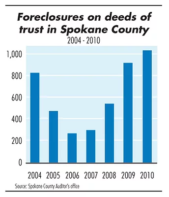 The Spokane County Auditor's Office reported 1,040 foreclosures on deeds of trust in 2010, up 12 percent from 925 foreclosures in 2009 and the highest level since foreclosures peaked at 1,152 in 2002 following the last recession. The rate of increase here in 2010, though, wasn't nearly as steep as in 2009, when total foreclosures climbed 65 percent, or 2008, when they soared 84 percent.