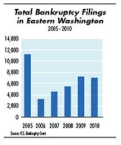 Supporting Morris' observation was a small increase in bankruptcy filings last year in Spokane County, one of 20 counties east of the Cascade Mountains that comprise the Bankruptcy Court's Eastern District. In all, consumers and businesses filed 2,573 bankruptcy filings in Spokane County last year, up 64 filings, or 2.5 percent, from 2009.