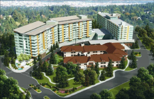 Rockwood Retirement Communities has started marketing apartments and hopes to begin construction within a year of its planned 93-unit, 10-story tower, The Summit, illustrated prominently in this new rendering. The Ridge tower, in the upper right portion of the rendering, will be renovated as part of the $78 million project. Walker Construction Inc., of Spokane, will be the contractor.