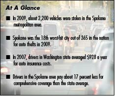Despite an increase in auto thefts in the Spokane area last year, auto insurance companies say drivers here most likely won't notice a difference in their premiums.