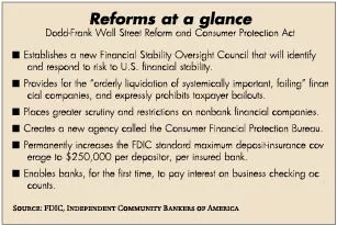 Among the pluses, the legislation directs the FDIC to base deposit-insurance assessments on a bank's assets minus tangible capital, instead of on domestic deposits, she says. That has the potential to make the largest banks in the U.S. pay a more proportionate amount into the FDIC fund, easing the strain on community banks that up until now have been carrying an unfair share of that expense, she says. The ICBA estimates that change will save the small banks $4.5 billion over the next three years.