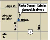 The development site is just east of Airway Heights, directly north of the 300-unit Cedar Summit Estates apartment complex, plans say. Cedar Builders also developed that 26-building apartment complex, which it constructed in phases starting in 2004.