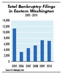 The number of bankruptcy filings in Eastern Washington fell last year for the first time since 2006. The decline was slight, however, and Spokane-area attorneys say they remain busy with a large volume of clients struggling to remain and businesses