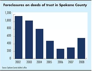 Foreclosures in Spokane County shot up 84 percent in the last year, but economic analysts here say that increase isn't too alarming yet, compared with the soaring foreclosure activity in other parts of the country.The county auditor reported 560